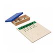 À l'aide du Tableau de division des unités, l'enfant s'entraîne aux tables de division avec les dividendes 1 à 81 et les diviseurs 1 à 9. Le matériel se compose d'une planche de travail de division d'unités, d'une boîte contenant 9 quilles unitaires vertes, d'un gobelet en perles vertes et d'une boî