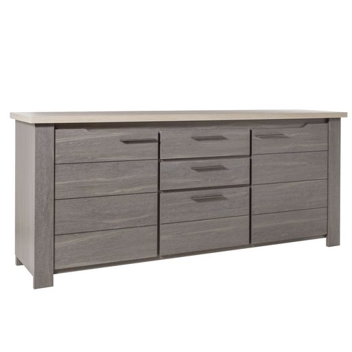 Corps et façades en panneaux de particules revêtus papier décor imitation frêne blanchi ou chêne baroque, chants même décor dont certains soft. Montants sur le devant des côtés en panneaux de fibres moyenne densité revêtus papier décor imitation frêne blanchi ou chêne baroque. Dessus en panneaux de particules mélaminés revêtus papier décor imitation chêne gris effet structuré ou chêne brut effet structuré. Chants ABS imitation chêne gris ou chêne brut sur pourtour des dessus. Poignées en aluminium laqué gris ou taupe. Caisses tiroirs en panneaux de particules revêtus PP imitation textile sur coulisses à galets blanches ou grises. Amortisseurs à la fermeture sur portes et tiroirs. Apport de sérigraphie sur certaines façades.