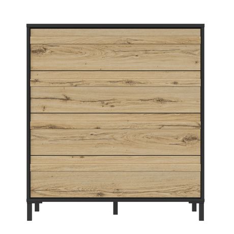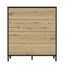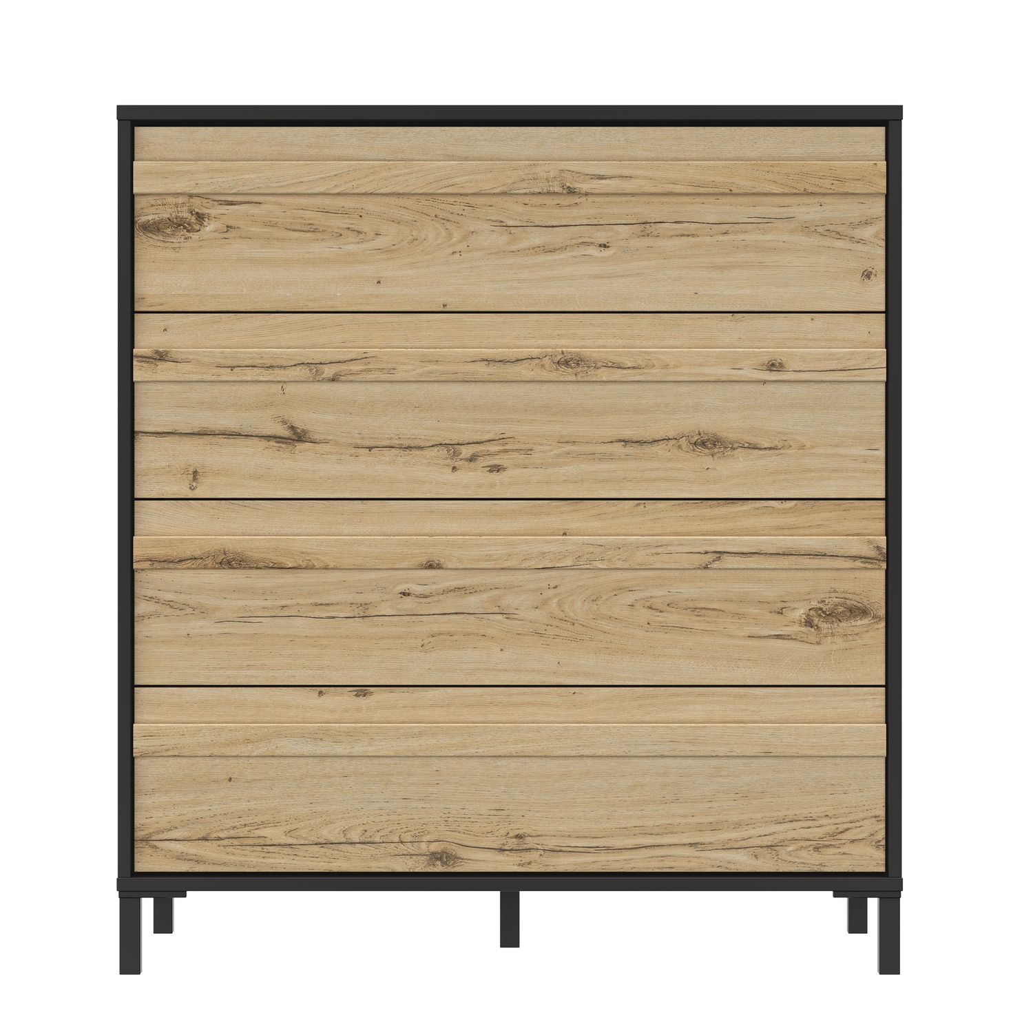 La commode Mezos idéale dans une chambre d'adulte avec un bi ton chêne et noir mat très tendances. Ce meuble de rangement fabriqué en France offre 4 grands tiroirs pour un rangement efficace et un design moderne et industriel à associer aux meubles de la même gamme.