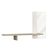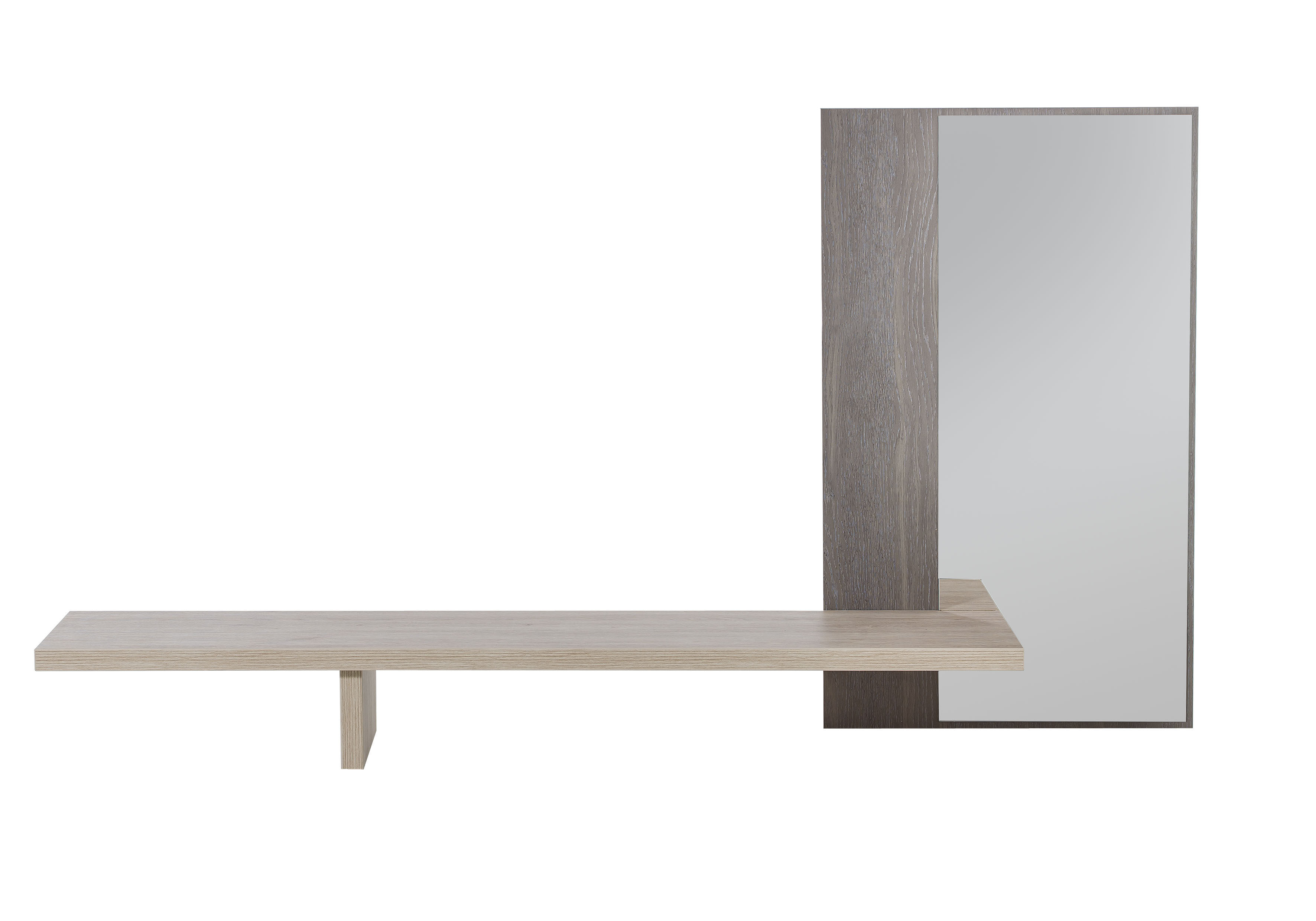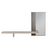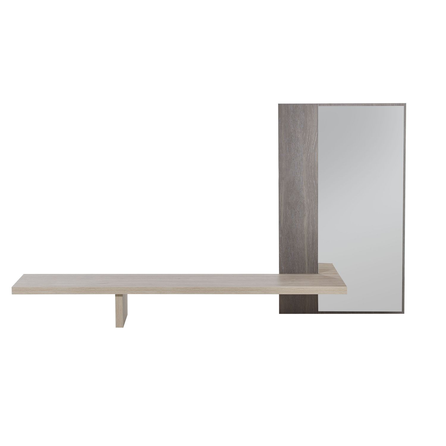 Corps et façades en panneaux de particules revêtus papier décor imitation frêne blanchi ou chêne baroque, chants même décor dont certains soft. Montants sur le devant des côtés en panneaux de fibres moyenne densité revêtus papier décor imitation frêne blanchi ou chêne baroque. Dessus en panneaux de particules mélaminés revêtus papier décor imitation chêne gris effet structuré ou chêne brut effet structuré. Chants ABS imitation chêne gris ou chêne brut sur pourtour des dessus. Verre clair trempé 4mm sur portes du surmeuble.