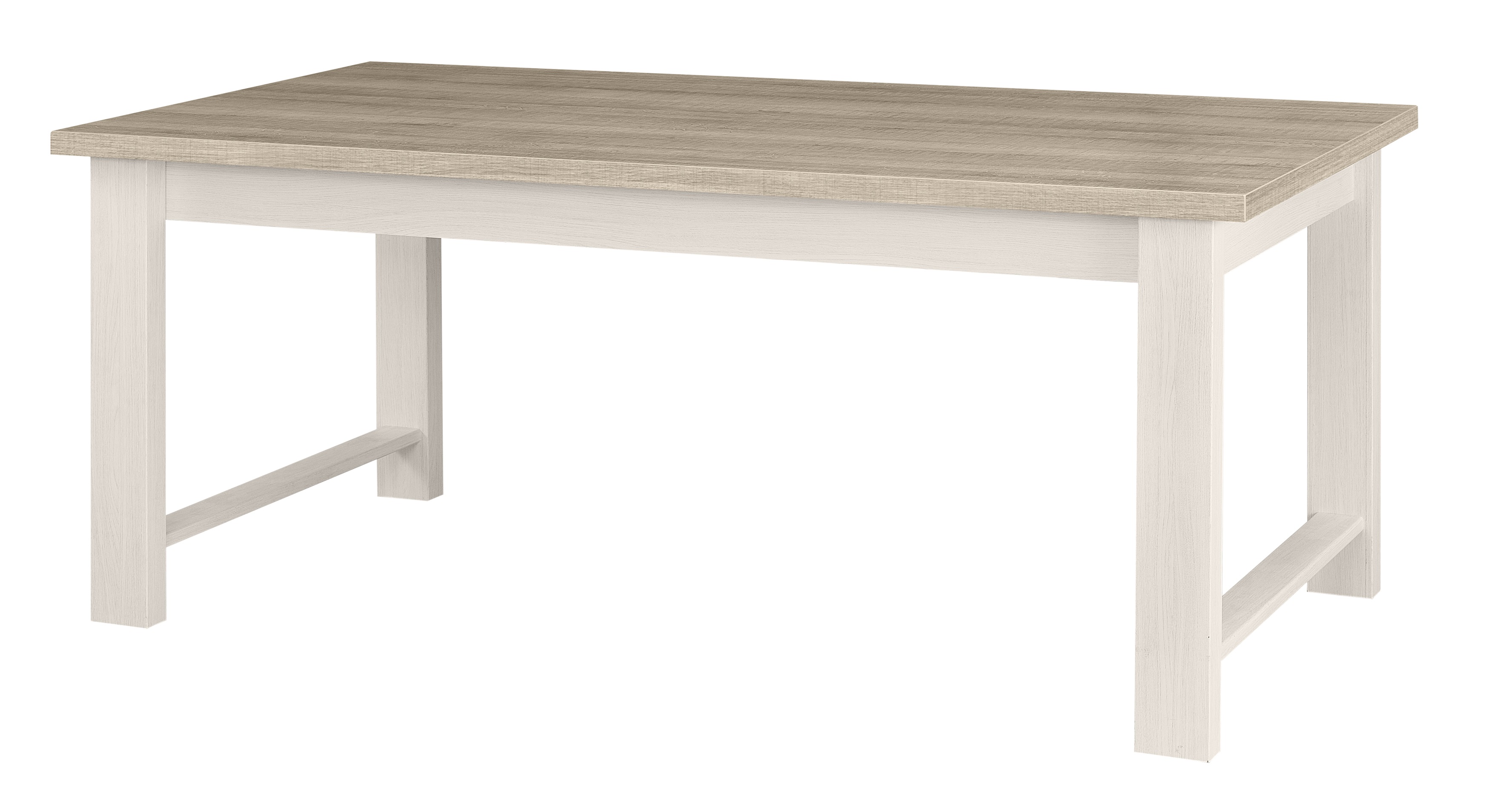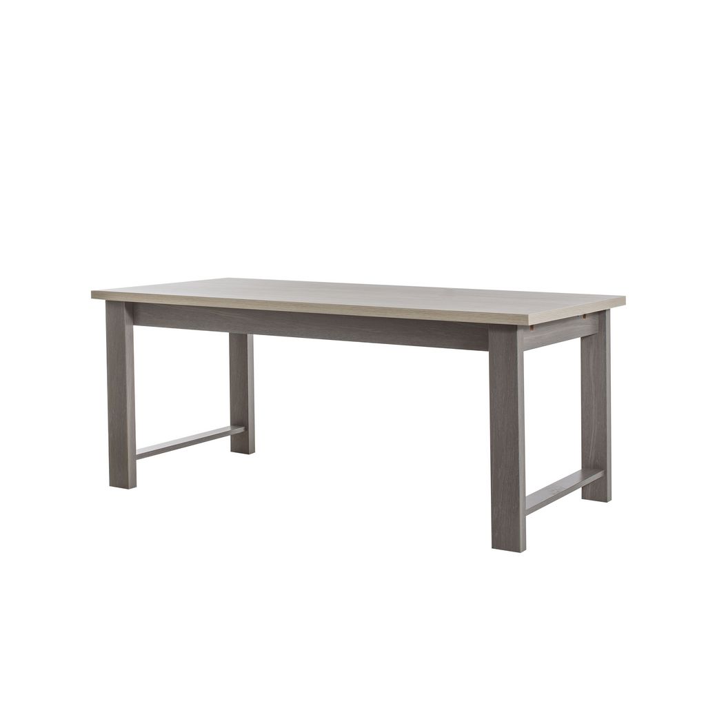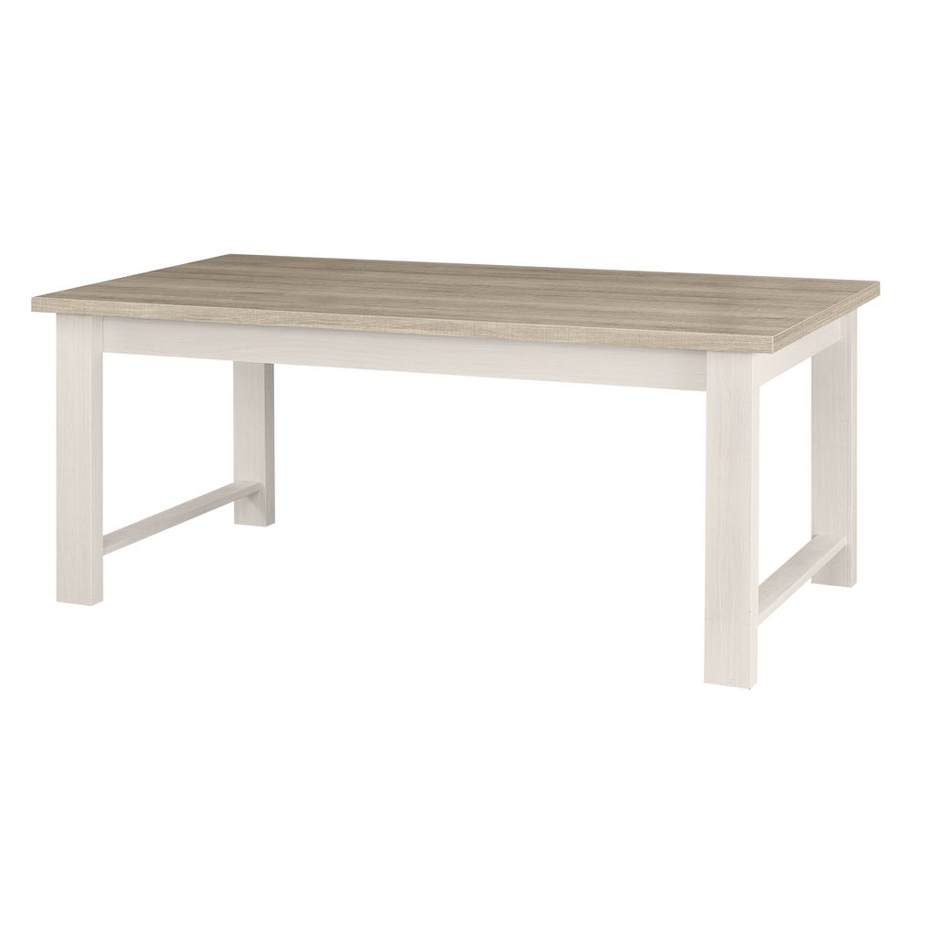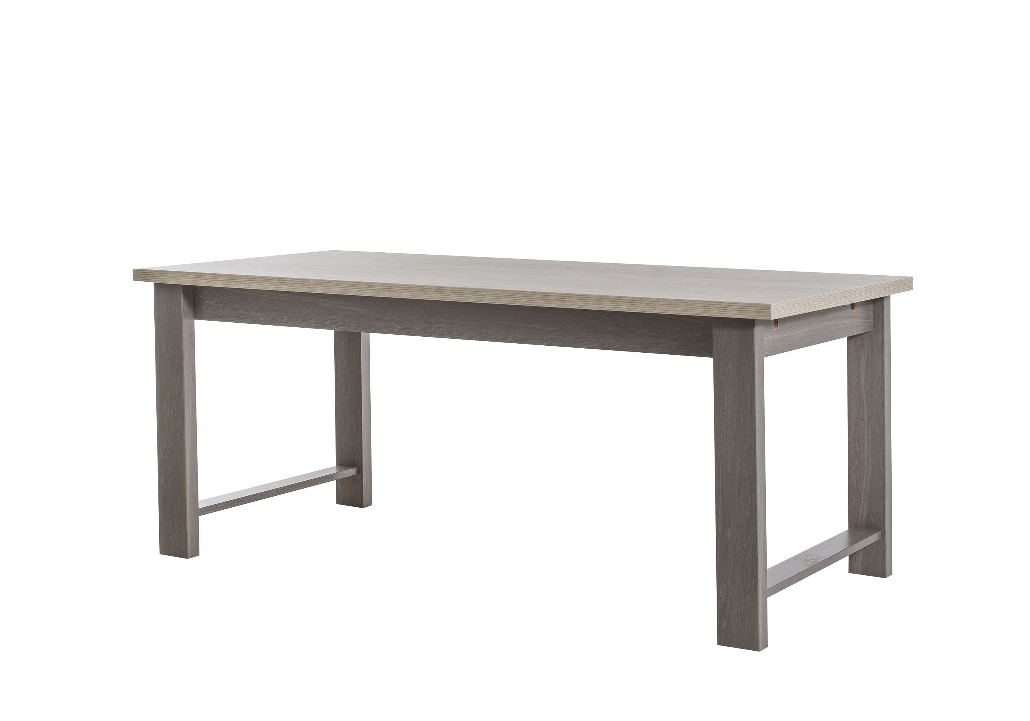 Corps et façades en panneaux de particules revêtus papier décor imitation frêne blanchi ou chêne baroque, chants même décor dont certains soft. Montants sur le devant des côtés en panneaux de fibres moyenne densité revêtus papier décor imitation frêne blanchi ou chêne baroque. Dessus en panneaux de particules mélaminés revêtus papier décor imitation chêne gris effet structuré ou chêne brut effet structuré. Chants ABS imitation chêne gris ou chêne brut sur pourtour des dessus. Ceintures des tables en panneaux lattés revêtus papier décor imitation frêne blanchi ou chêne baroque, piétements en panneaux de fibres moyenne densité revêtus papier décor imitation frêne blanchi ou chêne baroque. Apport de sérigraphie sur certaines façades.