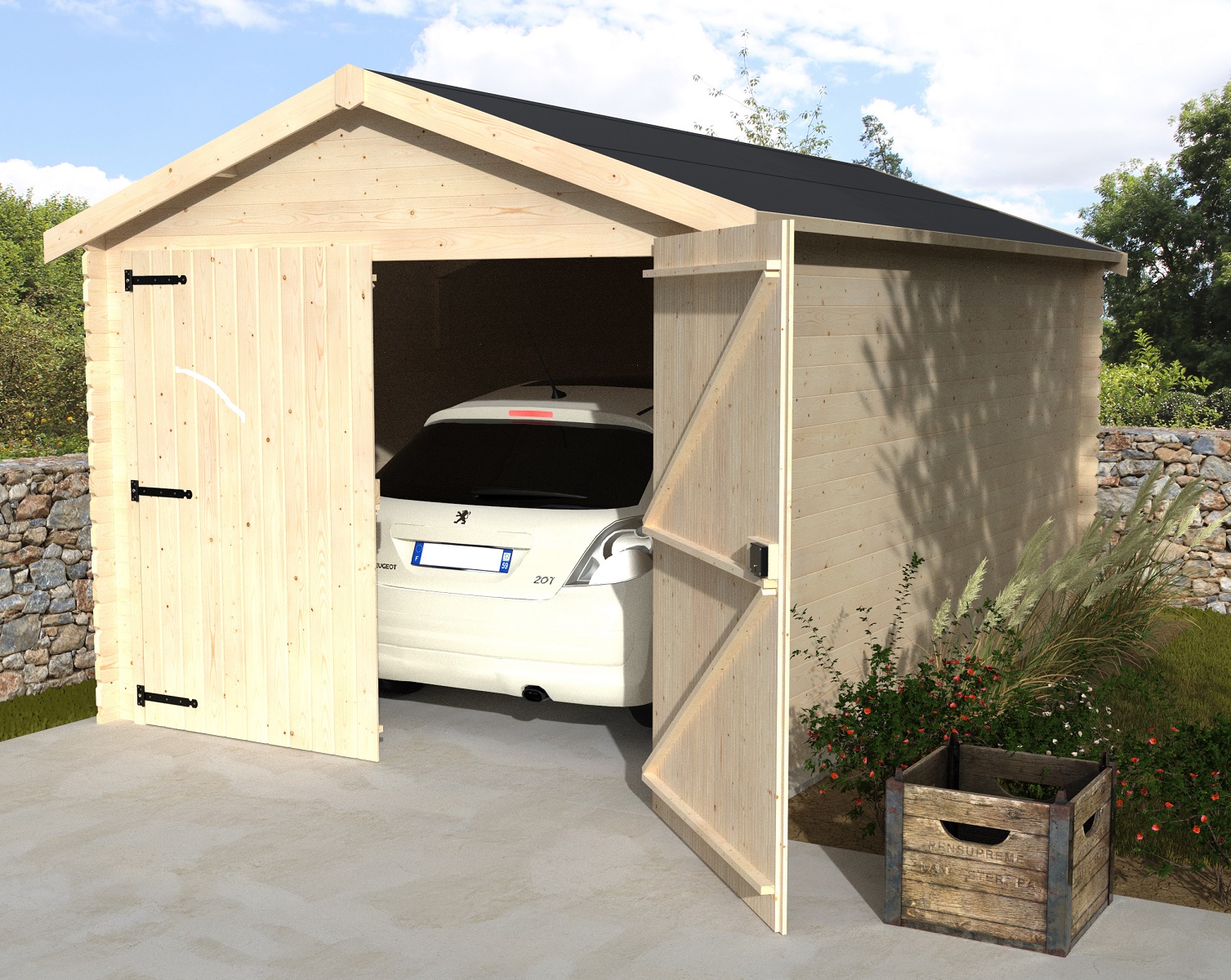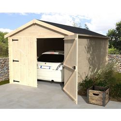 Garage en bois Pihama est idéal pour ajouter un garage à votre extérieur et protéger votre voiture des intempéries ou du vol. Sa toiture noire bitumée est esthétique. Les parois sont en sapin du Nord naturel. Traités les avant de les monter pour augmenter la durée de vie de l'abri.