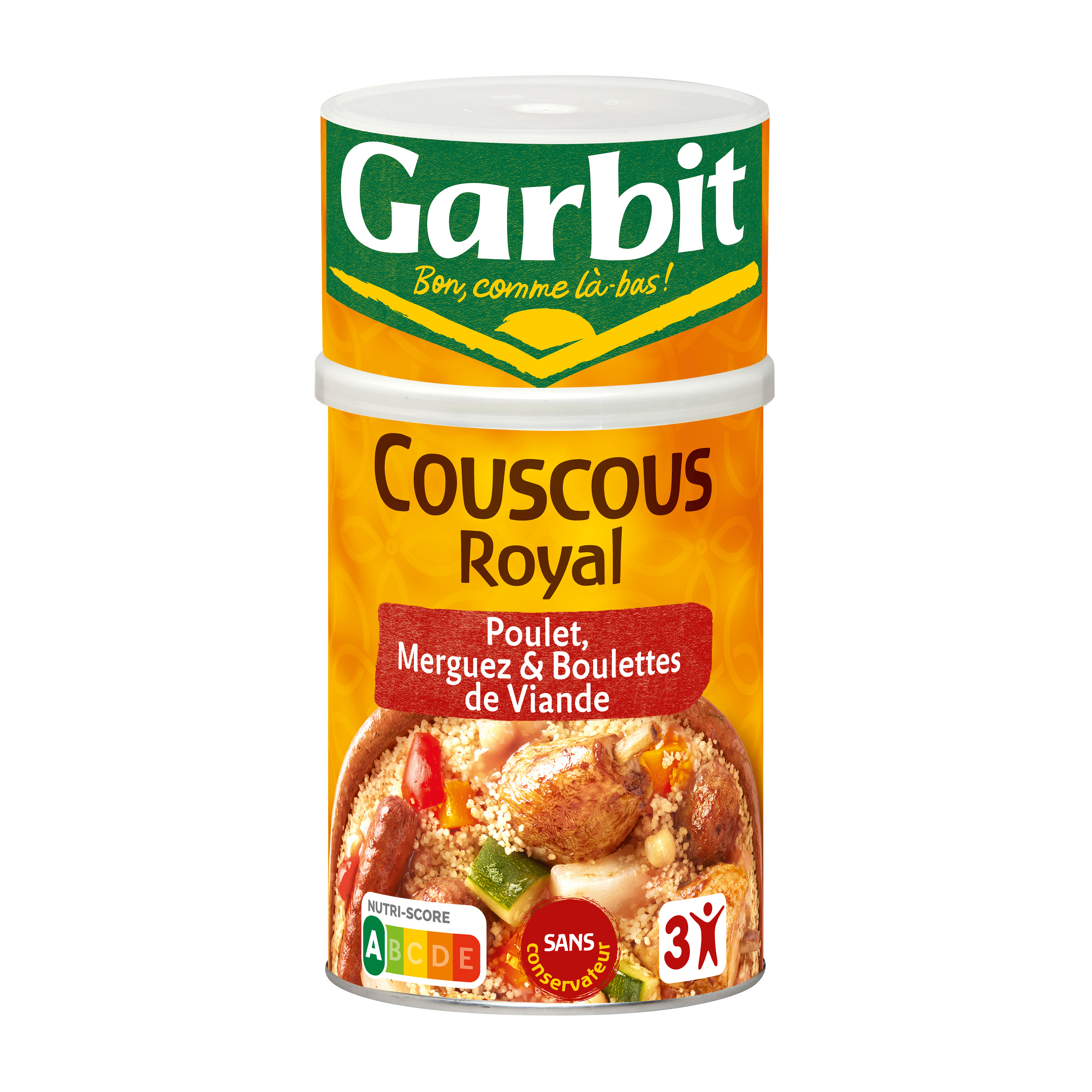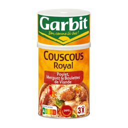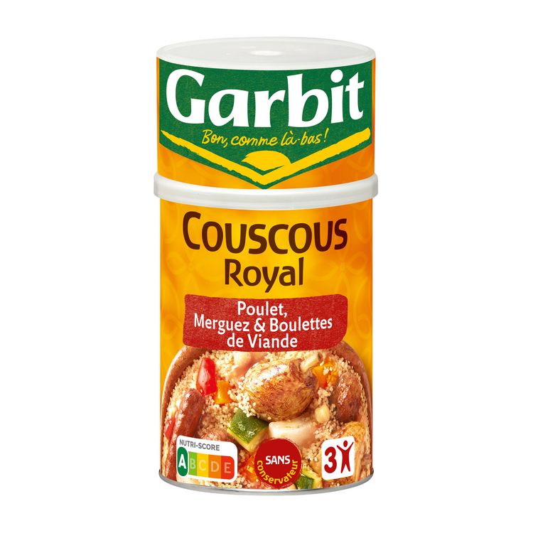 Destination Gourmandise 6 min Découvrez toute l'évasion du Couscous Royal : Une semoule légère et aérée, des viandes tendres et des légumes cuisinés dans un bouillon subtilement relevé par une pointe d'épices ! Pour retirer la coupelle, retournez la boîte et tirez soigneusement vers le bas. 1) Faites chauffer la garniture 6 min à feu doux et à couvert OU 6 min au micro-ondes à puissance maximale dans un plat adapté et couvert. 2) Faites bouillir 30 cl d'eau légèrement salée. Hors du feu, ajoutez 25 g de beurre ou 1 cuillère à soupe d'huile d'olive dans l'eau bouillante et versez-y la semoule. Laissez gonfler 2-3 min à couvert, avant de réchauffer à feu doux 5 min, en égrenant la semoule avec une fourchette. Dans un bol, délayez le contenu du sachet d'épices avec quelques cuillères à soupe du bouillon de la garniture. Servez séparément la semoule, la garniture et la sauce épicée. PS : nos plats Garbit sont cuisinés avec un taux de sel maîtrisé, inutile de les resaler ! Pour encore plus de plaisir, ajoutez quelques feuilles de coriandre fraîche !