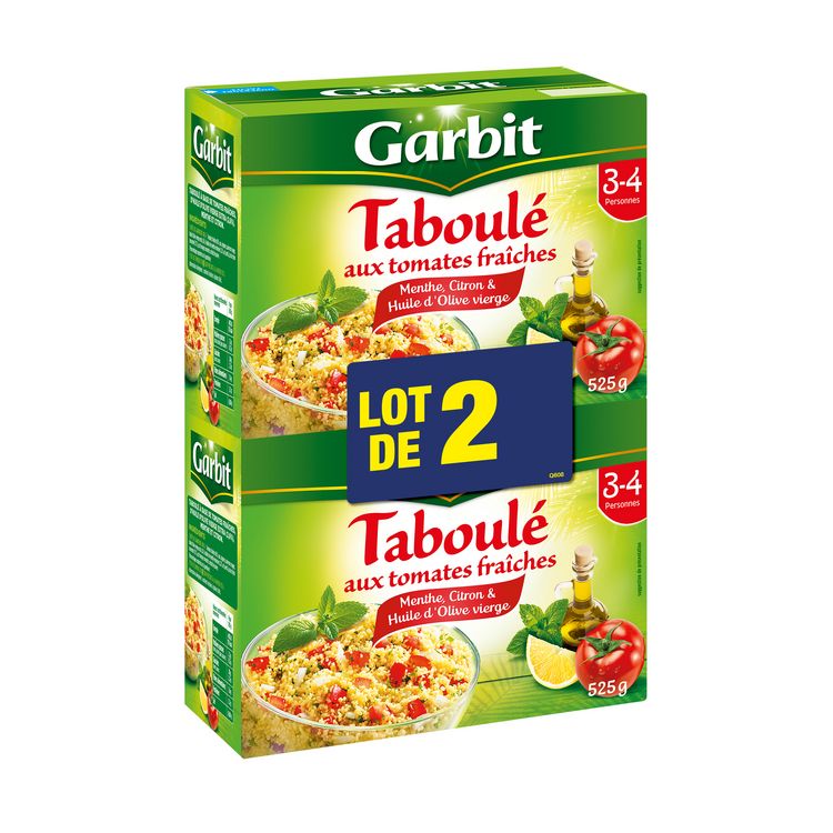 Destination Gourmandise en 5 min Découvrez toute la fraîcheur du Taboulé aux tomates fraîches Garbit : De la menthe, un filet d'huile d'olive et du citron, pour un savoureux mariage des saveurs ! Versez la semoule dans un plat creux. Ajoutez la garniture et une cuillière à soupe d'huile d'olive puis mélangez (ne pas faire cuire, ne pas ajouter d'eau). « Picto réfrigérateur 30 minutes» Placez au réfrigérateur 30 minutes avant de servir. Pour encore + de plaisir, ajoutez des poivrons rouges et des cubes de concombre