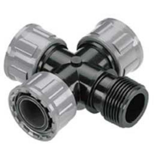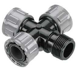 Raccord croix. Pour connecter et faciliter le montage des électrovannes Système d',écrou pour un montage - démontage - pratique et facile des électrovannes. Avec 3 sorties femelles 26/34 et 1 sortie mâle 26/34