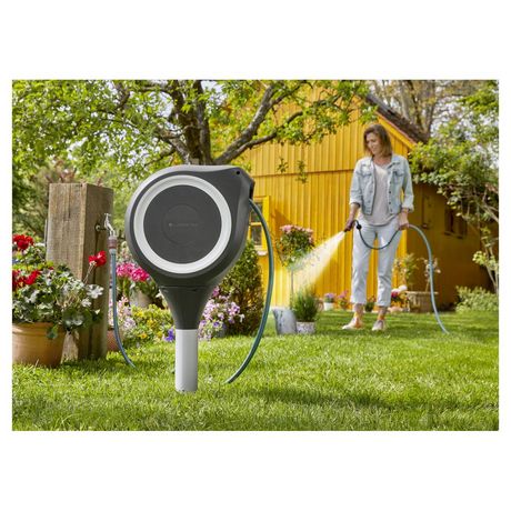 Le dévidoir automatique sur pic RollUp S - 15m GARDENA est idéal pour arroser les petits jardins. C’est une solution d’arrosage et de nettoyage très pratique pour avoir son tuyau d’arrosage toujours prêt à l’emploi et bien rangé. Une fois fixé au sol, le dévidoir automatique