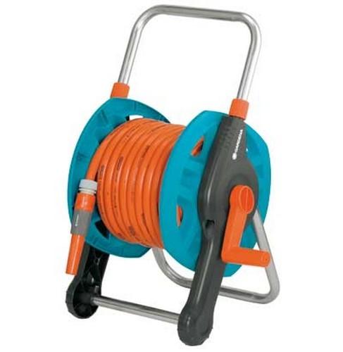 Devidoir d',arrosage portable gardena, rangement pratique grâce au socle d',appui repliable. Equipé de 20 mètres de tuyau 13 mm. 1 adaptateur 3 raccords 1 lance