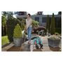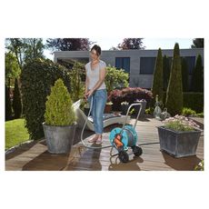 "Ce dévidoir sur roues possède 20 m de tuyau ø 13mm, une poignée télescopique pour régler le guidon, un raccord de tuyau coudé et raccord de tuyau anti-goutte. Il est résistant contre le gel. Livré monté."