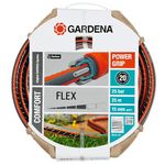 Tuyau d',arrosage de la gamme FLEX de Gardena, diamètre 15 mm longueur 25m, avec renfort tricoté en carbone. Le tuyau d',arrosage est équipé de la bande PowerGrip pour une connexion parfaite entre le tuyau et le raccord d',arrosage.