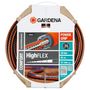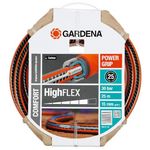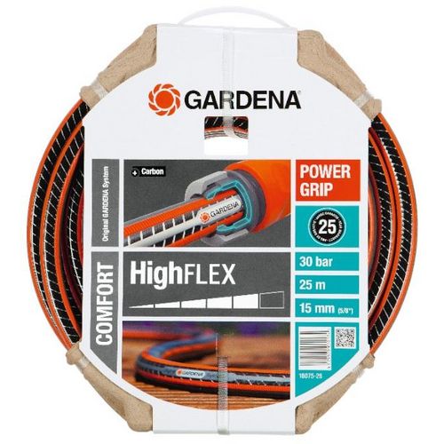 Couronne de 25 m de tuyau d',arrosage de la gamme HIGHFLEX de Gardena. Diamètre 15 mm. Avec renfort tricoté. Le tuyau est équipé de la bande PowerGrip pour une connexion parfaite entre le tuyau et le raccord d',arrosage. Grande résistance à la pression et stabilité de forme grâce au renfort de carbone tricoté à enroulement en spirale. Ne plie pas, ne forme pas de noeuds et ne vrille pas.