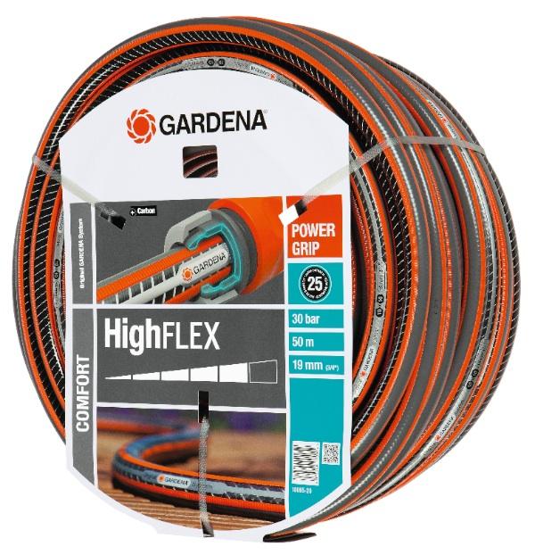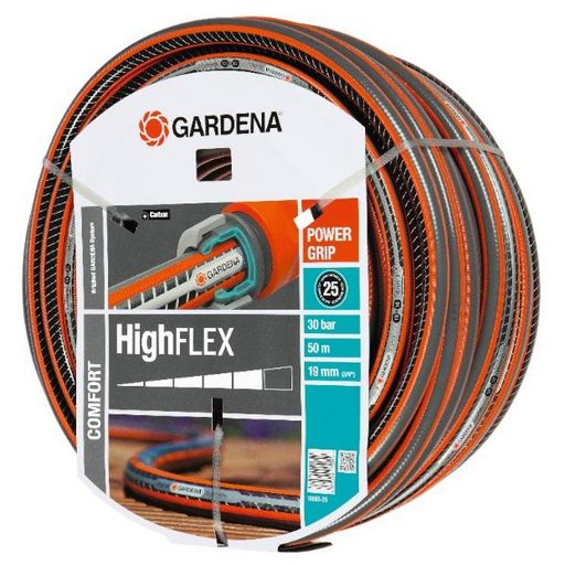 Couronne de 50 m de tuyau d',arrosage de la gamme HIGHFLEX de Gardena. Diamètre 19 mm. Avec renfort tricoté. Le tuyau est équipé de la bande PowerGrip pour une connexion parfaite entre le tuyau et le raccord d',arrosage. Grande résistance à la pression et stabilité de forme grâce au renfort de carbone tricoté à enroulement en spirale. Ne plie pas, ne forme pas de noeuds et ne vrille pas.