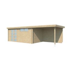 L'abri de jardin Apetina 505x295cm avec extension de 300cm et paroi arrière de Gardenas est fait en bois épicéa 28mm). D'un design sobre et moderne, cet abri de jardin cubique est couvert d'une toiture métallique avec protection anti-condensation. Double porte et fenêtre fixe avec plexi.