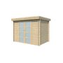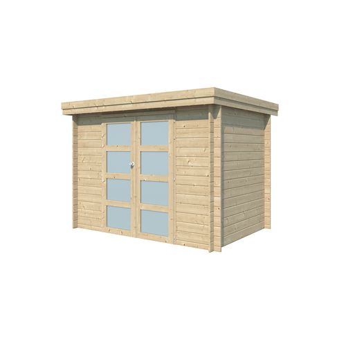 L'abri de jardin Apetina 295x205cm de Gardenas est fait en bois épicéa 28mm non traité. D'un design sobre et moderne, cet abri de jardin cubique est couvert d'une toiture métallique avec protection anti-condensation. Double porte avec plexi.