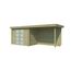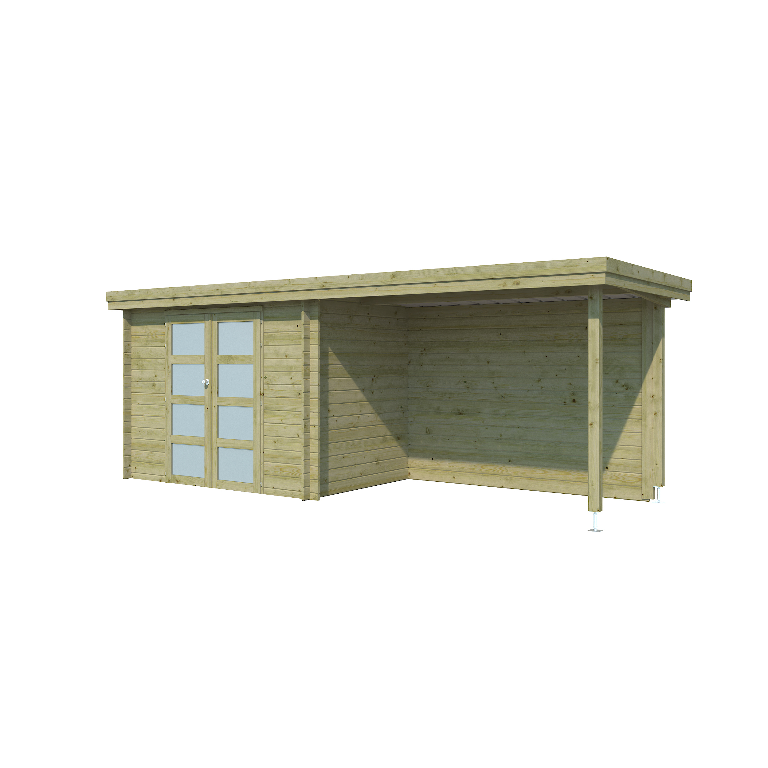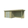 L'abri de jardin Apetina 295x205cm avec extension de 300cm et paroi arrière de Gardenas est fait en bois épicéa 28mm imprégné (autoclave). D'un design sobre et moderne, cet abri de jardin cubique est couvert d'une toiture métallique avec protection anti-condensation. Double porte avec plexi.