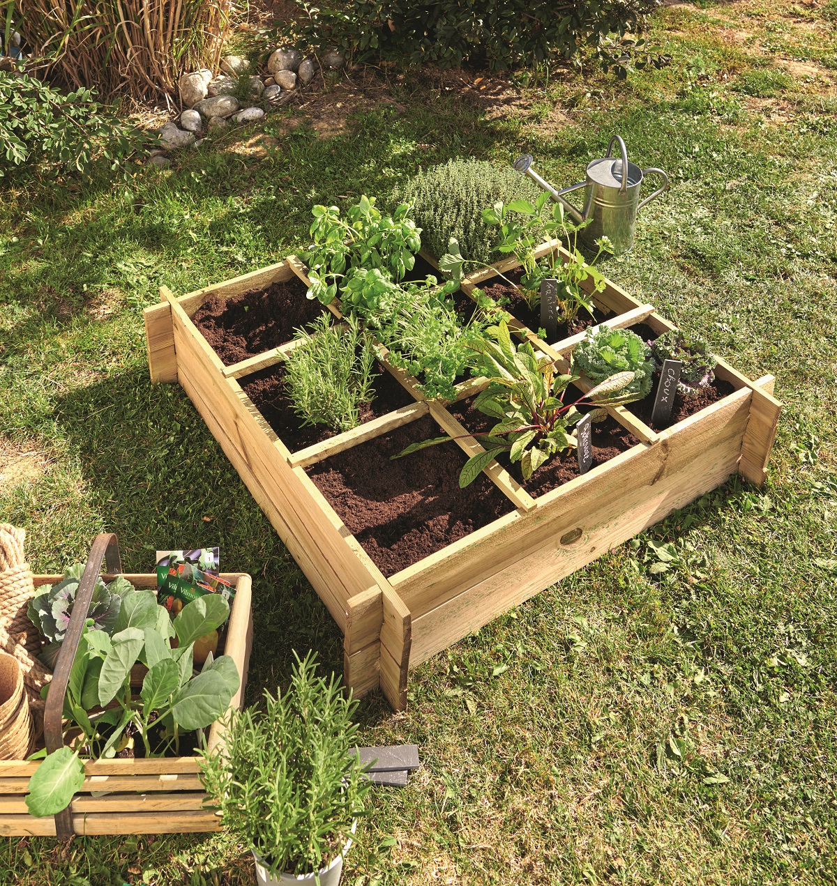 Joli carré potager de 120 x 120 cm idéal pour y planter fleurs et légumes pour petits jardins. Il est en bois autoclavé lui assurant une longévité dans le temps.