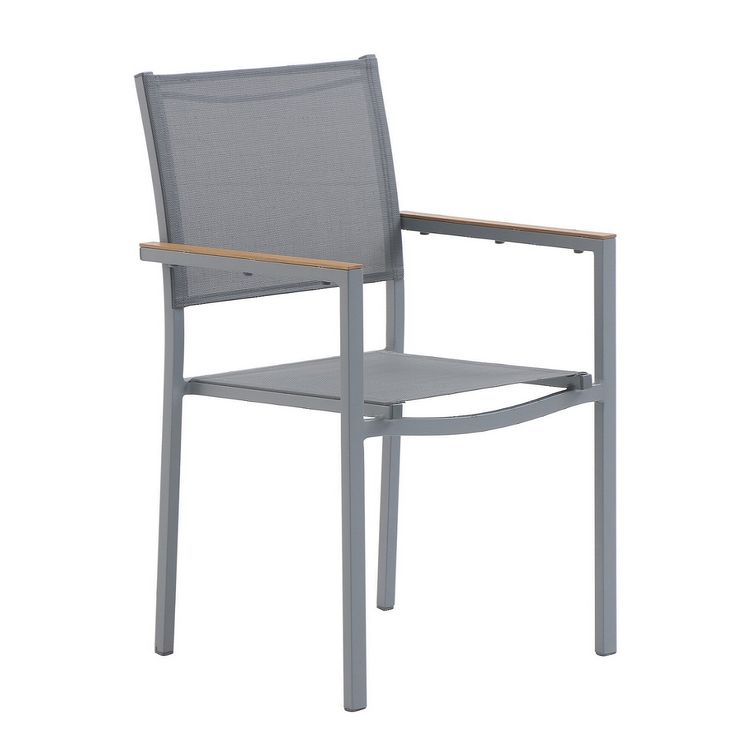 Fauteuil gris acier empilable en aluminium textilene. Dimensions :55x56x87cm -Tuyau bras et pied avant:30x20mm Bras avec peinture au pinceau. Cadre : avec revêtement textilène:2x1