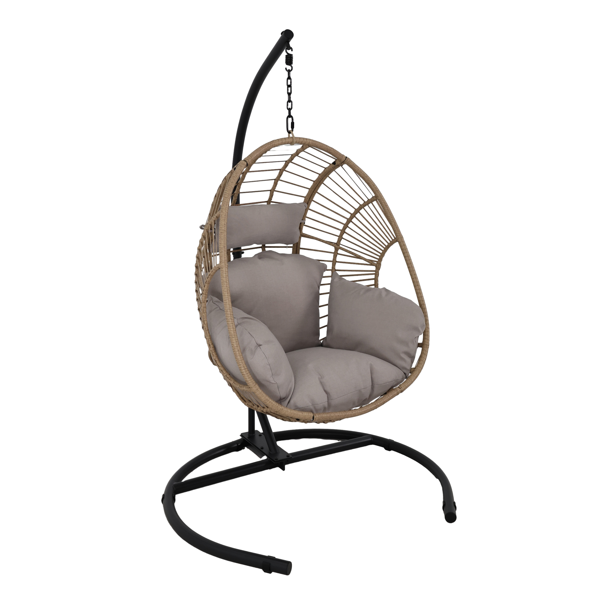 Structure en acier pour chaise suspendue avec revêtement en poudre Taille : W120*D118*H184 cm Rotin : 8/12 mm Tissu en polyester filé : 230 g Tube principal : Dia.42*3.0/45*1.5/32*1.5/25*1.0mm