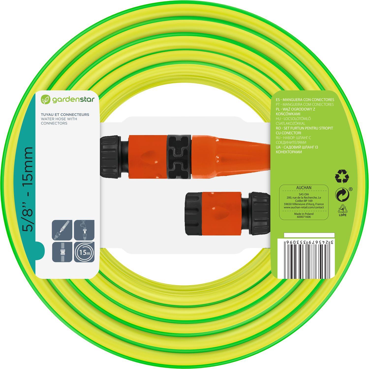 Ce kit tuyau d'arrosage GARDENSTAR de 15 mètres de longueur de de 15 mm de diamètre vous permettra d'arroser tout votre jardin facilement. Il contient : lance droite, raccord rapide + raccord rapide stop + nez de robinet + tuyau d'arrosage D 15mm, L 15m. Le tuyau est antivrille et ne se tord pas ! S