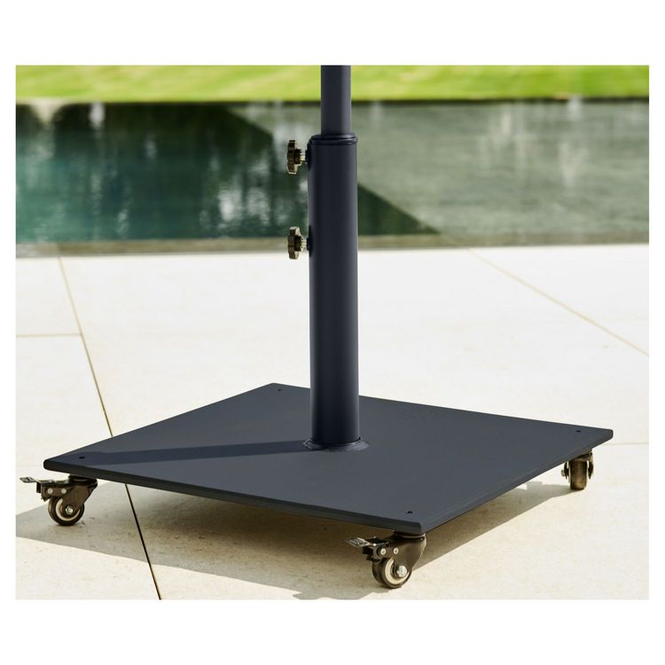 Ce pied de parasol en acier dispose de roues pour vous faciliter le déplacement de ce dernier !