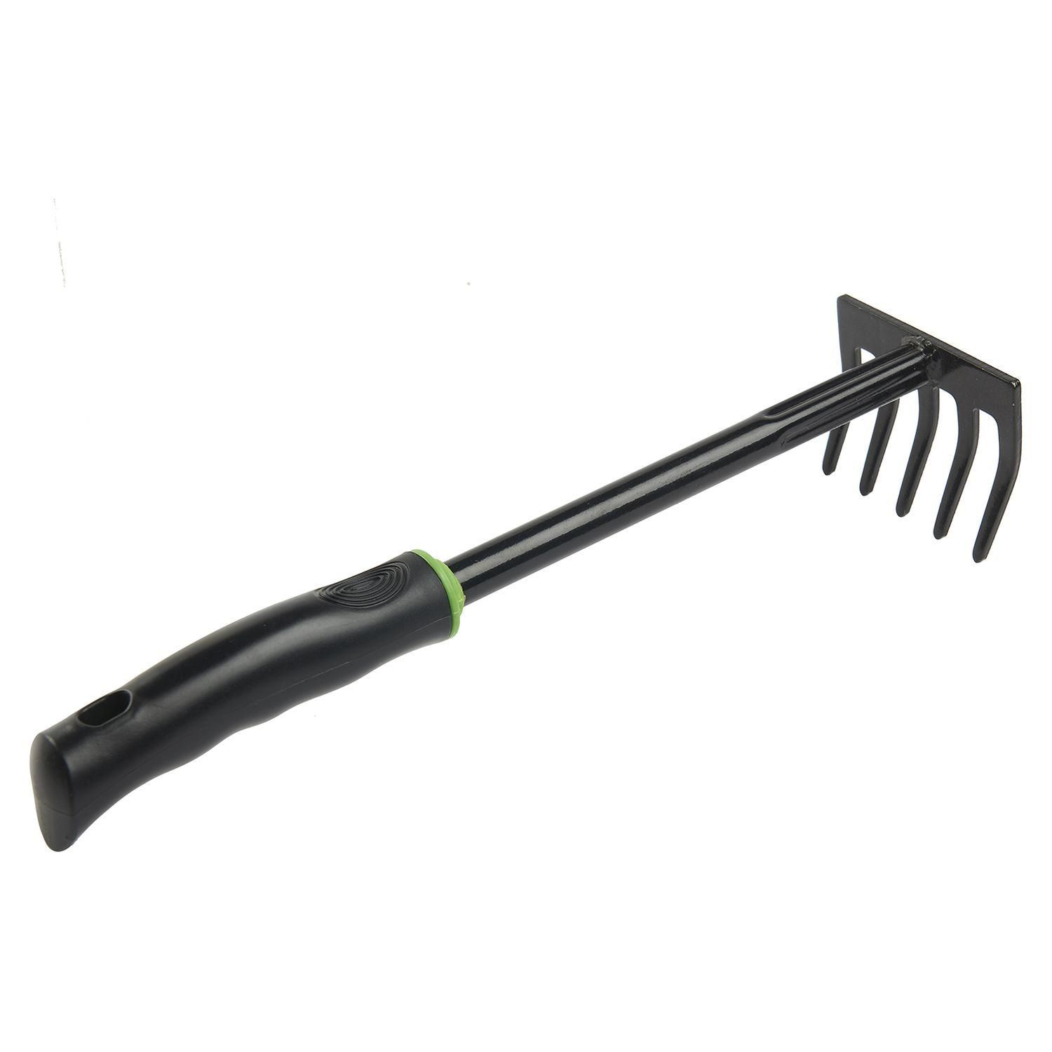 Pour ratisser et égaliser votre terre, GARDENSTAR a conçu ce râteau à 5 dents avec tête en acier, revêtement en poudre noir, taille : 32x8.5cm, manche en plastique double couleur