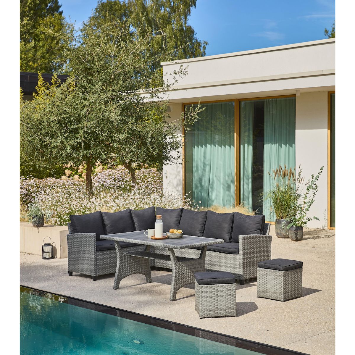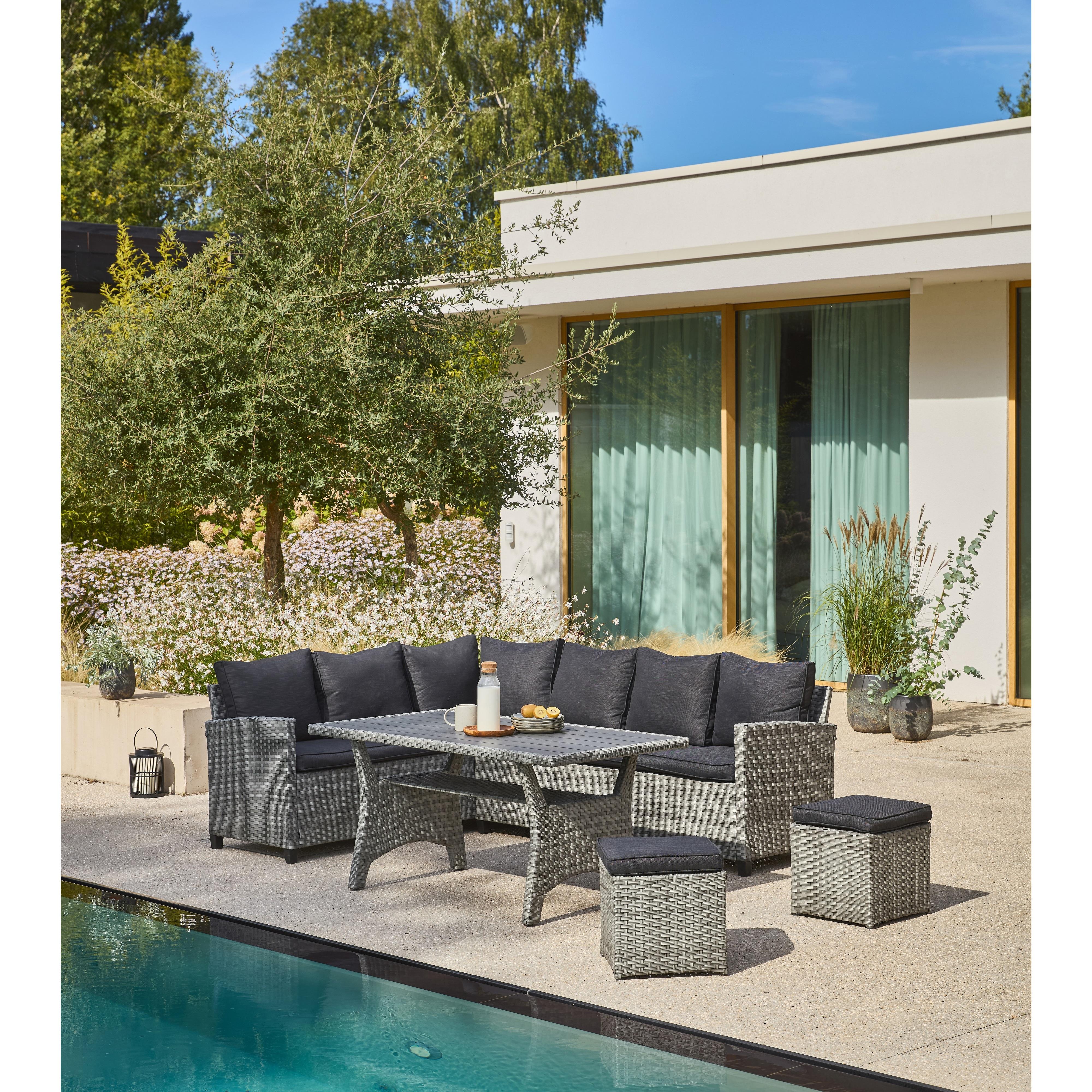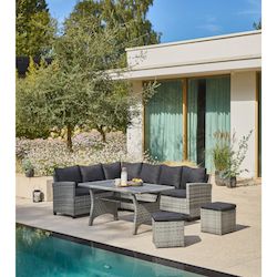 Salon Cancun : 1 table haute + 1 canapé d'angle + 2 poufs
