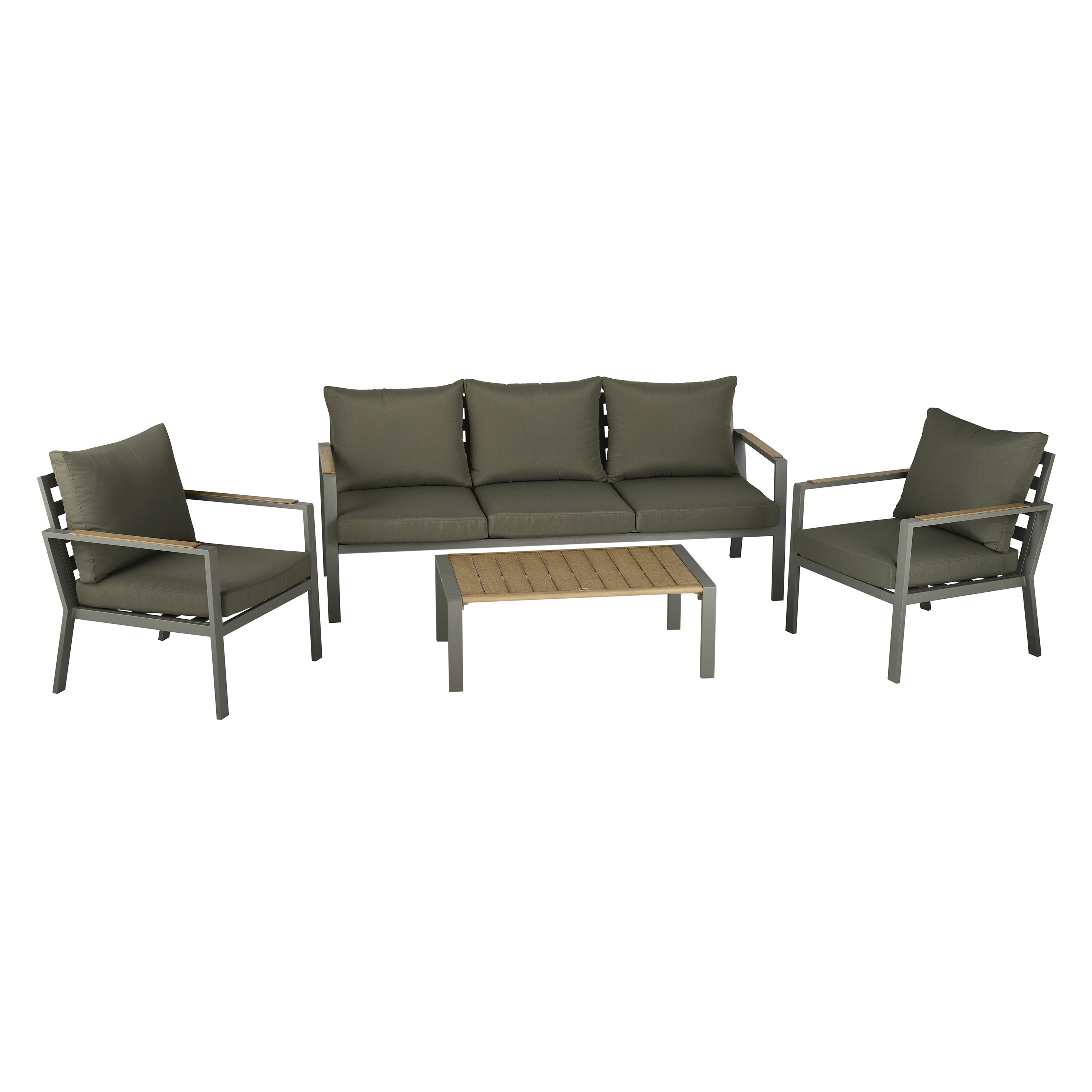 Ensemble salon Alu (1set=2 chaises+1 canapé+1 table) Chaise : 755*700*780mm Canapé 3 places : 755*1900*780mm Table : 950*580*345mm avec plateau en aluminium effet bois brossé à la main ; Tube de pied de canapé : 50*20 mm, tube de siège et de dossier : 40*20 mm et 30*20 mm, tube de cadre de table : 20*30 mm, tube de pied de table : 20*50 mm, cadre en aluminium avec revêtement en poudre ; 180g de spunpoly pour tissu de coussin.
