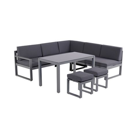 salon de jardin en aluminim, 6 personnes et +, composé de : une table : 120x70x69cm, un canapé 2 places 130x69x70, un canapé 3 places 213x69x70cm, et de deux tabourets 40x40x35cm