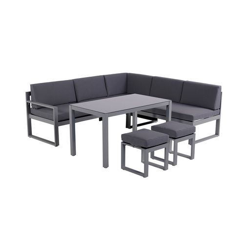 Ce salon de jardin ALICANTE est un salon de jardin très pratique. En effet, il peut être utilisé comme salon repas, mais aussi comme salon de détente. Il est composé d'un canapé 2 places, un canapé 3 places, une table et 2 tabourets. Vous pourrez y accueillir confortablement jusqu'à 6 personnes.