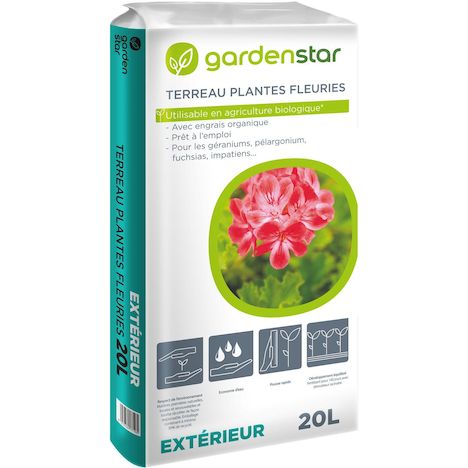 Le terreau pour plantes fleuries GARDENSTAR sera parfait pour vos géraniums, pélargoniums, fuchsias, impatients .. Avec engrais organique. Utilisable pour l'agriculture biologique *