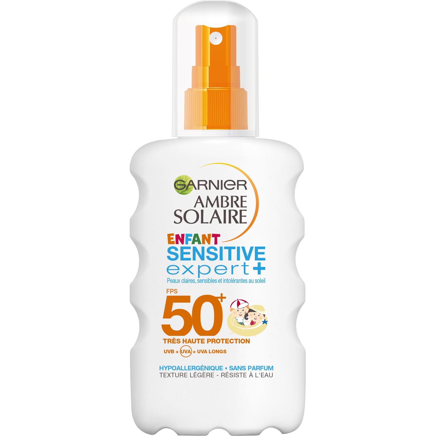 Garnier Ambre Solaire Sensitive Expert+ Enfant Spray protecteur pour les peaux claires, sensibles et intolérantes au soleil. Très haute protection FPS50+ contre les UVB, UVA et UVA Longs. Hypoallergénique. Sans parfum. Texture légère. Résiste à l'eau. Garnier Ambre Solaire Sensitive Expert+ Enfant Spray Protecteur FPS 50+ 200 ml