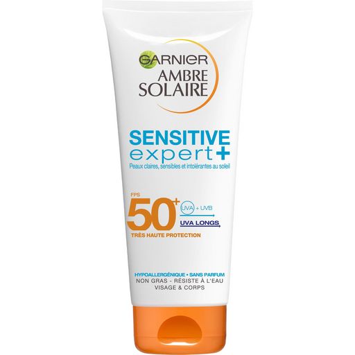 Garnier Ambre Solaire Sensitive Expert+ Lait FPS 50+ : la protection renforcée contre les UVA longs spécifique peaux claires, sensibles et intolérantes au soleil. Formule hypoallergénique, testée sous contrôle médical. Sans paraben, sans parfum et sans colorant. Garnier Ambre Solaire Sensitive Expert+ Lait FPS 50+ 200 ml