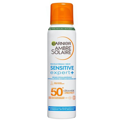 La brume hypoallergénique adulte FPS50+ Sensitive Expert+, à base de céramide et testée sous contrôle dermatologique protège la barrière cutanée. Non gras, non collant. Aérosol recyclable. Protection contre les UVA, UVB et UVA longs