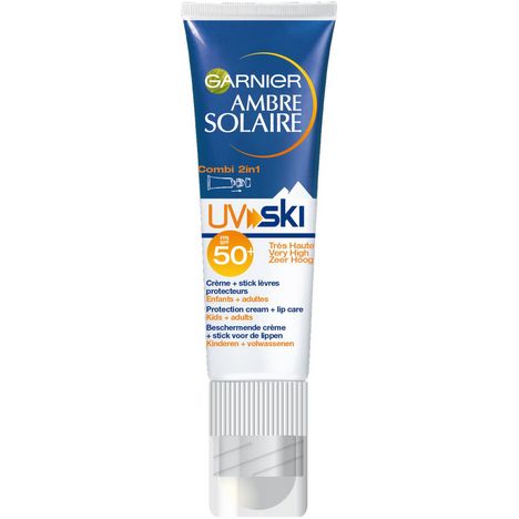 Garnier Amb.Solaire + Uv Ski UV SKI Crème protectrice + Stick lèvres protecteurs Combi 2en1 pour haute montagne anti UVA / UVB en altitude ; anti-dessèchement dû au froid et au vent Recommandée pour affronter les premiers rayons en montagne et pour protéger les peaux claires et fragiles tout au long de l'exposition