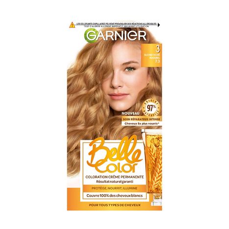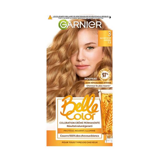 Découvrez Belle Color de Garnier, la coloration permanente au résultat naturel garanti pour une couleur resplendissante tout en couvrant 100% de vos cheveux blancs. LE SECRET D'UNE COULEUR NATURELLE ET LUMINEUSE Grâce à sa formule unique et brevetée enrichie en huile de germe de blé et en actifs protecteurs, Garnier Belle Color protège vos cheveux pendant la coloration tout en respectant leurs contrastes naturels. Son soin réutilisable nourrit la fibre sans l'alourdir. Elle couvre 100% des cheveux blancs, sans effet casque. 3 BIENFAITS PROTEGE pendant la coloration grâce à ses actifs protecteurs NOURRIT intensément le cheveu ILLUMINE durablement votre couleur Coloration facile et inratable : sa texture crème unique s'applique comme un shampooing pour une répartition facile. Résultat naturel garanti: respecte les contrastes naturels de vos cheveux grâce aux colorants nuanceurs présents dans la formule pour un résultat naturel, comme si c’était votre couleur d’origine!