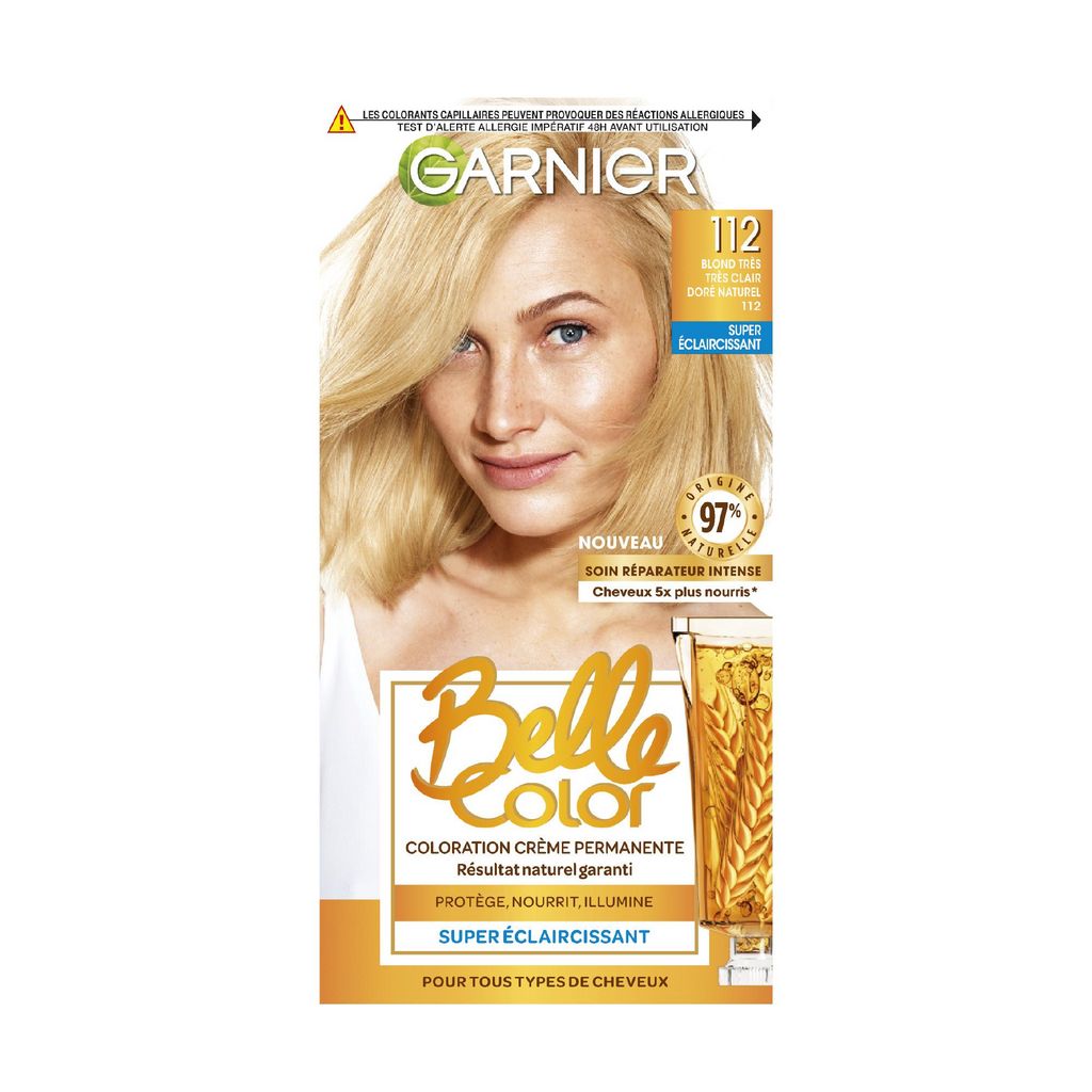 Découvrez Belle Color de Garnier, la coloration permanente au résultat naturel garanti pour une couleur resplendissante tout en couvrant 100% de vos cheveux blancs. LE SECRET D'UNE COULEUR NATURELLE ET LUMINEUSE Grâce à sa formule unique et brevetée enrichie en huile de germe de blé et en actifs protecteurs, Garnier Belle Color protège vos cheveux pendant la coloration tout en respectant leurs contrastes naturels. Son soin réutilisable nourrit la fibre sans l'alourdir. Elle couvre 100% des cheveux blancs, sans effet casque. 3 BIENFAITS PROTEGE pendant la coloration grâce à ses actifs protecteurs NOURRIT intensément le cheveu ILLUMINE durablement votre couleur Coloration facile et inratable : sa texture crème unique s'applique comme un shampooing pour une répartition facile. Résultat naturel garanti: respecte les contrastes naturels de vos cheveux grâce aux colorants nuanceurs présents dans la formule pour un résultat naturel, comme si c’était votre couleur d’origine!
