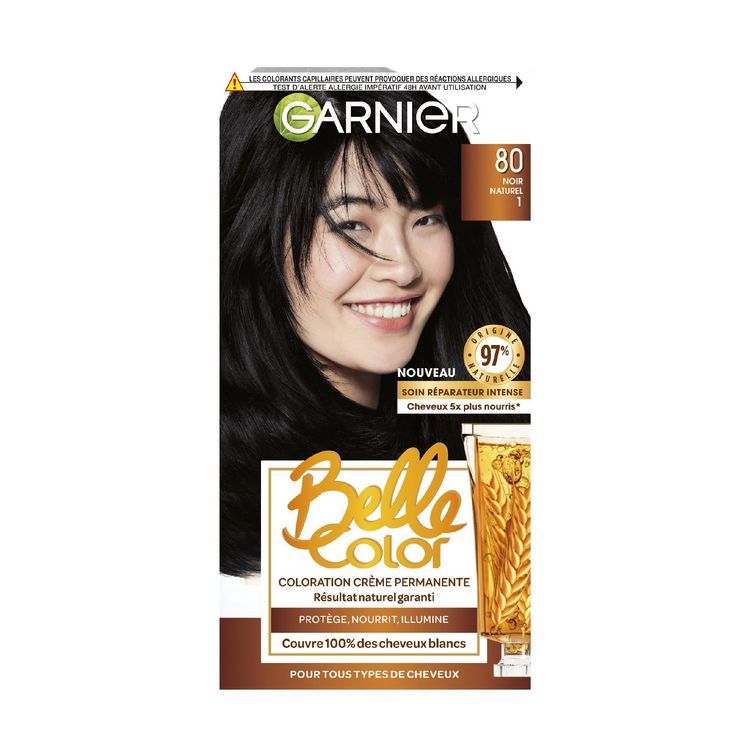 Découvrez Belle Color de Garnier, la coloration permanente au résultat naturel garanti pour une couleur resplendissante tout en couvrant 100% de vos cheveux blancs. LE SECRET D'UNE COULEUR NATURELLE ET LUMINEUSE Grâce à sa formule unique et brevetée enrichie en huile de germe de blé et en actifs protecteurs, Garnier Belle Color protège vos cheveux pendant la coloration tout en respectant leurs contrastes naturels. Son soin réutilisable nourrit la fibre sans l'alourdir. Elle couvre 100% des cheveux blancs, sans effet casque. 3 BIENFAITS PROTEGE pendant la coloration grâce à ses actifs protecteurs NOURRIT intensément le cheveu ILLUMINE durablement votre couleur Coloration facile et inratable : sa texture crème unique s'applique comme un shampooing pour une répartition facile. Résultat naturel garanti: respecte les contrastes naturels de vos cheveux grâce aux colorants nuanceurs présents dans la formule pour un résultat naturel, comme si c’était votre couleur d’origine!