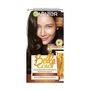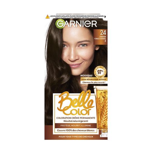 Découvrez Belle Color de Garnier, la coloration permanente au résultat naturel garanti pour une couleur resplendissante tout en couvrant 100% de vos cheveux blancs. LE SECRET D'UNE COULEUR NATURELLE ET LUMINEUSE Grâce à sa formule unique et brevetée enrichie en huile de germe de blé et en actifs protecteurs, Garnier Belle Color protège vos cheveux pendant la coloration tout en respectant leurs contrastes naturels. Son soin réutilisable nourrit la fibre sans l'alourdir. Elle couvre 100% des cheveux blancs, sans effet casque. 3 BIENFAITS PROTEGE pendant la coloration grâce à ses actifs protecteurs NOURRIT intensément le cheveu ILLUMINE durablement votre couleur Coloration facile et inratable : sa texture crème unique s'applique comme un shampooing pour une répartition facile. Résultat naturel garanti: respecte les contrastes naturels de vos cheveux grâce aux colorants nuanceurs présents dans la formule pour un résultat naturel, comme si c’était votre couleur d’origine!