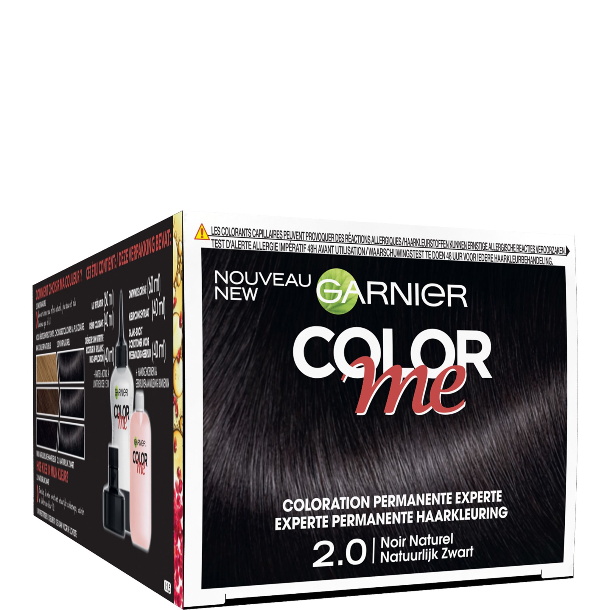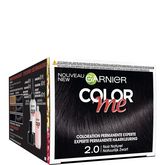 GARNIER 2,0 COLOR ME NOIRNATUREL "La 1ère Couleur faite pour vous à la nuance près. Il y a forcément une couleur Color Me faite pour vous : avec la plus large palette de couleurs, 60 nuances formulées au demi-ton près, présentes sur toutes les familles de couleurs et tous les reflets, trouvez la couleur qui vous ressemble ! Grâce à son applicateur Color-Clic intuitif, la couleur est prête en 1 clic, pour une application facile. Une formule aux colorants ultra-concentrés, pour une couleur précise à la brillance professionnelle, qui couvre 100% des cheveux blancs. Un soin nutritif protecteur enrichi à l’extrait de Grenade et Huile de Lin : la couleur est préservée, elle dure longtemps. Choisissez le Noir Naturel 2.0 Color Me, un noir intense aux reflets naturels, plus doux et plus lumineux que le 1.0."