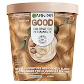 Découvrez la nouvelle expérience coloration à domicile : plus naturelle, plus sensorielle et plus simple. Une formule composée de 90% d’ingrédients d’origine naturelle, sans ammoniaque* et vegan** et du beurre de karité dans le soin. Un packaging avec un pot éco conçu avec 45% de plastique en moins (vs kit classique Garnier). Une application ultra-sensorielle à la main (avec les gants fournis dans l’étui) comme un masque grâce à sa texture crémeuse. Enfin, elle couvre 100% des cheveux blancs*** pour un résultat naturel jusqu’à 8 semaines***. Découvrez les 12 nuances GOOD, du brun truffé au blond très clair camomille en passant par le rouge grenade. *dans la crème colorante. **pas d'ingrédients d'origine animale ou dérivée. ***tests instrumentaux. Une couleur naturelle aux reflets multiples jusqu'à 8 semaines*. Couverture de 100% des cheveux blancs*. Une application sensorielle à la main comme un masque (avec les gants fournis). *tests instrumentaux
