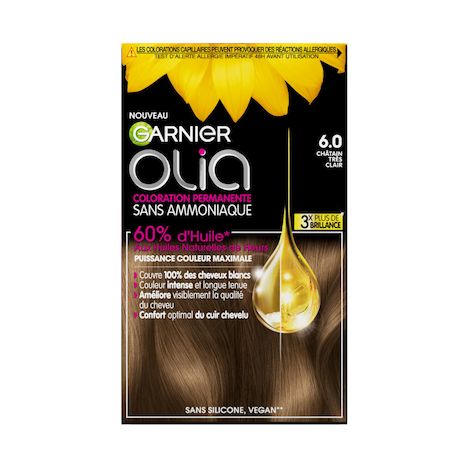 1ere fois avec Garnier Olia, bien que le chatain très clair n° 6 donne un résultat un peu foncé, Suis ravie de l'effet produit sur mes cheveux, ils paraissent moins fins et plus nombreux Après 3 semaines l'ensemble est toujours brillant, doux, la coloration (bien que foncé au départ) est toujours belle. Bon ! d'accord il est temps de recommencer pour les racines. 😃 Je prendrai Blond n° 7 la prochaine fois En plus l'odeur n'est pas désagréable comme beaucoup de coloration et le soin inclus est parfait et suffisant pour 5 shampoing à la suite