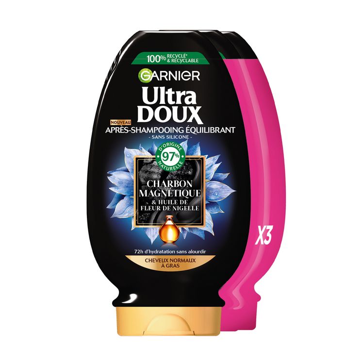 Après-Shampooing Equilibrant Garnier Ultra Doux au Charbon Magnétique et Huile de Fleur de Nigelle pour cheveux normaux à gras. Résultat : Le charbon magnétique et l'huile de fleur de Nigelle agissent comme un aimant pour capter le sébum du cuir chevelu et maintenir les longueurs hydratées.