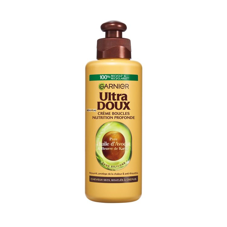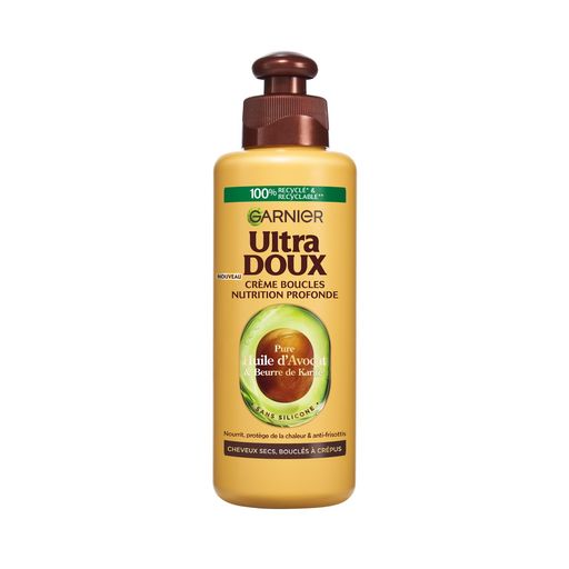 Crème de soin nutrition sans rinçage Garnier Ultra Doux à l'Huile d'Avocat et au Beurre de Karité pour les cheveux secs, bouclés à crépus. Résultat : les cheveux sont nourris intensément, protégés de la chaleur, plus faciles à coiffer. Ils sont souples, brillants et doux au toucher et les boucles sont définies, sublimées.