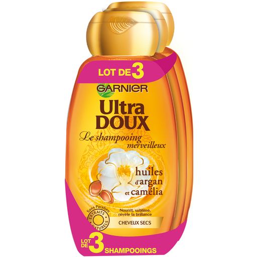 Shampooing embellisseur capillaire pour les cheveux secs 3x250ml Garnier Ultra Doux le Shampooing merveilleux huiles d'argan et camélia 3x250ml