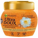 Masque nourrissant sans silicone et sans paraben Garnier Ultra DOUX à l'huile d'argan et camélia pour cheveux secs. Résultat : immédiatement vos cheveux sont nourris en profondeur et protégés jusqu'aux pointes. Ils retrouvent souplesse et douceur jusqu'aux pointes et redeviennent brillants, resplendissant de beauté !
