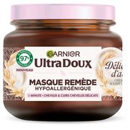 Masque Remède Hydratant sans parabène Garnier Ultra Doux à la crème de riz et au lait d'avoine pour cheveux délicats. Résultat : En 1 minute, vos cheveux sont plus hydratés, plus doux et en pleine santé. Hydratés en profondeur, vos cheveux sont enveloppés de soin sur toute leur longueur, sans être alourdis. Ils deviennent plus souples, plus brillants, d’une infinie douceur.
