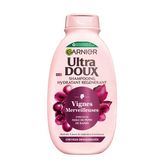 Riche en eau et protégé par des antioxydants, le raisin résiste aux agressions extérieures et conserve longtemps son éclat. Ultra Doux s'inspire des vignes pour créer une nouvelle gamme de soins pour les cheveux déshydratés, exposés quotidiennement à des agressions telles que le brossage, le coiffage avec des appareils chauffants ou les rayons UV.Avec Vignes Merveilleuses, les cheveux très secs sont hydratés pendant 4 jours* et retrouvent une superbe brillance. Ce shampooing nettoie en douceur, hydrate intensément et régénère la brillance des cheveux déshydratés. Ce flacon est fabriqué à partir de plastique 100 % recyclé (à l'exception des colorants, additifs, bouchon et étiquettes). *Tests instrumentaux pour l'utilisation du Shampooing + Masque