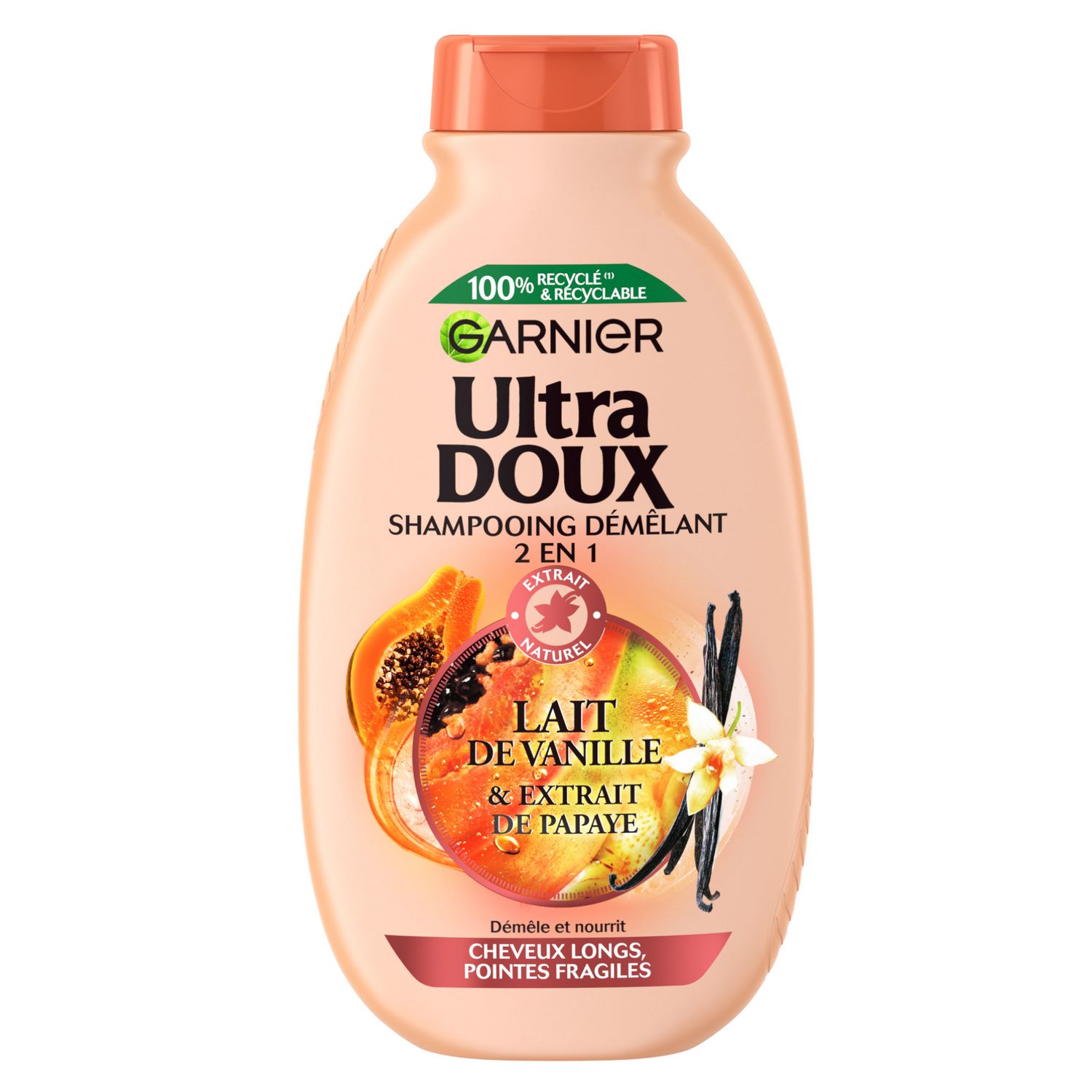 garnier, ultra doux, shampooing, demelant, 2 en 1, vanille, papaye, cheveux longs, shampoing