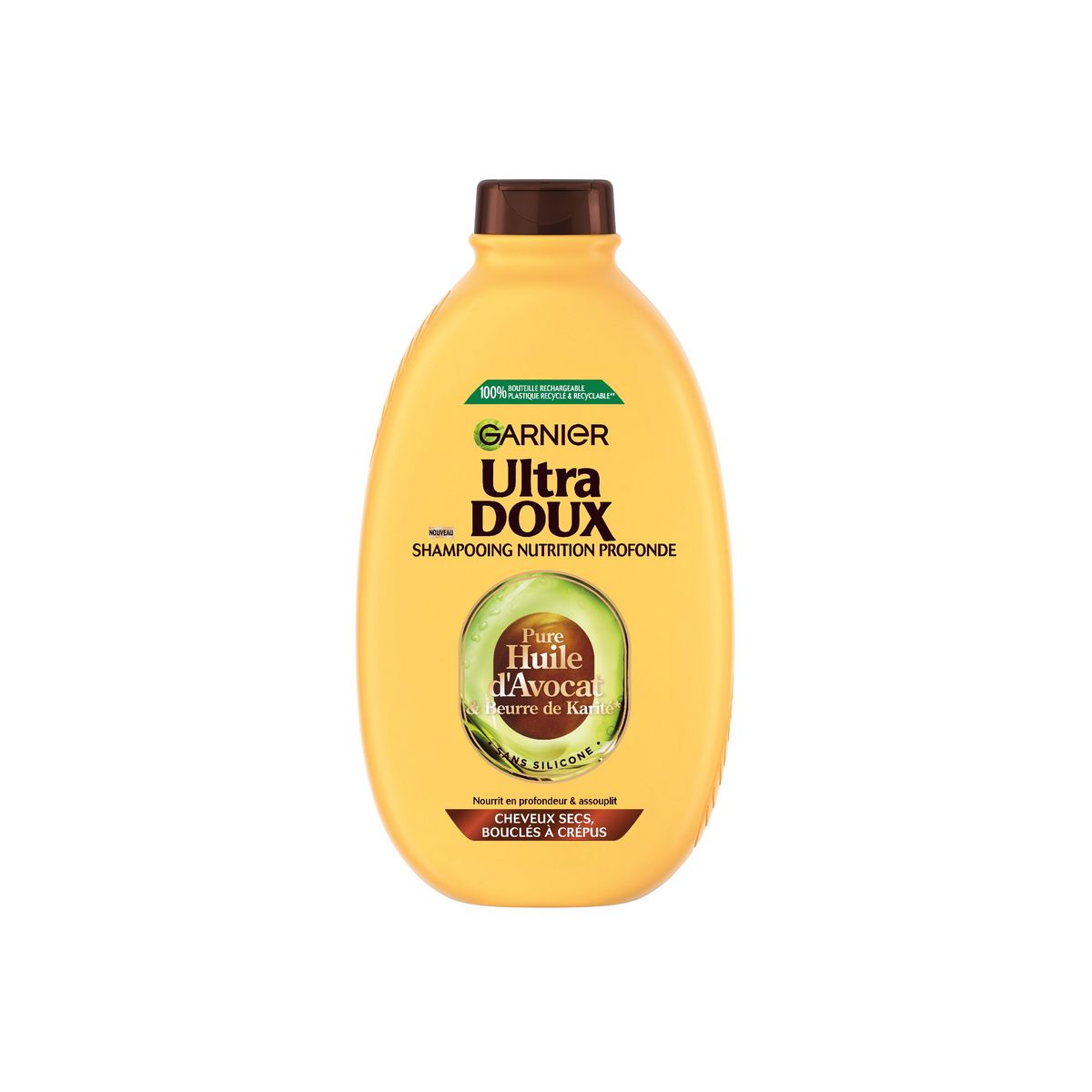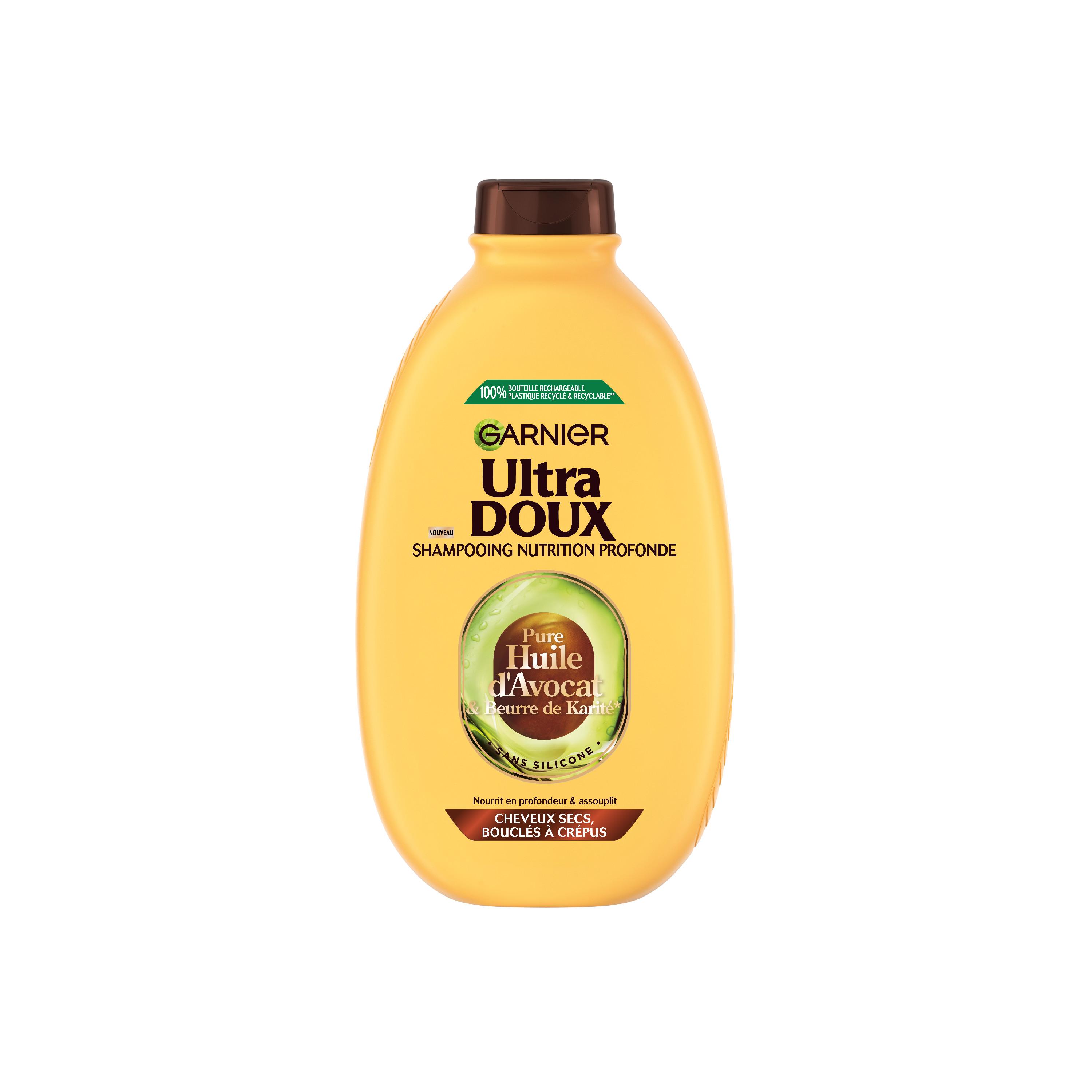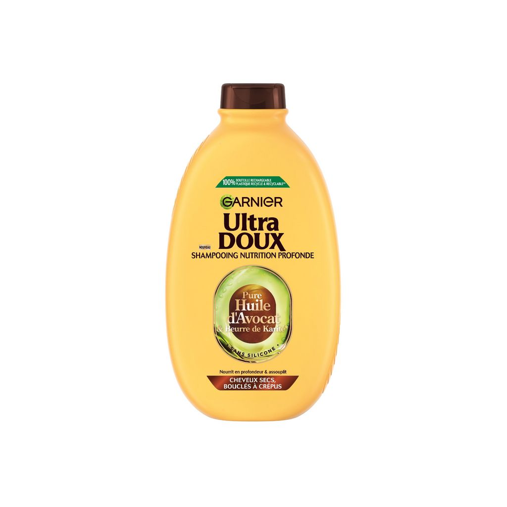 Shampooing Garnier Ultra Doux nourrissant à l'Huile d'Avocat et au Beurre de Karité pour les cheveux secs, bouclés à crépus. Résultat : les cheveux secs, bouclés à crépus, sont propres et nourris, plus faciles à coiffer, pour une chevelure sublimée !