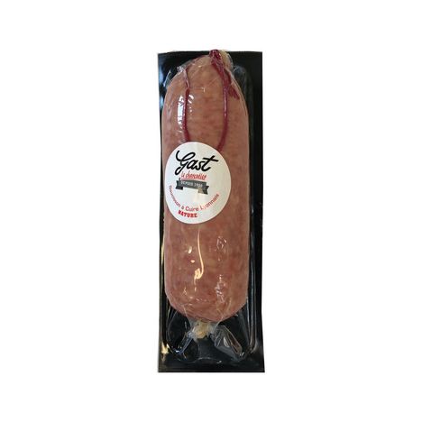 Viande de porc,gras de porc, eau, sel, dextrose, sirop de glucose, épices et plantes aromatiques, antioxydant : E301 ; arôme naturel, conservateur : E250 ; ferment (support : saccharose). Boyau naturel de bœuf.