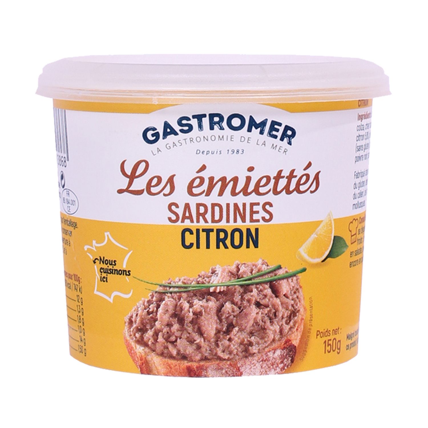 SARDINES 34,3%, eau, huile de colza, chair de CABILLAUD, oignons, jus de citron 5,6%, huile de tournesol, fibres de blé (sans gluten), persil, sel, ciboulette 0,4%, poivre noir, sarriette, piment fort.